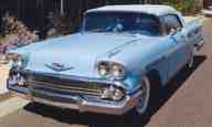 1958 Chevrolet Impala Convertible Beautifully older restored with complete frame-off restoration with less than 4,000 miles. This Cashmere Blue car sports a 348 engine with cast iron power glide transmission and a General Motors 3/2 setup with original metal air cleaner. The car is equipped with a wide range of options including a 3:36 posi rear end, power steering, power brakes, padded dash, a very rare wonderbar radio, tissue dispenser, rear seat speaker with switch, accessory windshield washer unit, dual rear antennas, exhaust ports, dual side mirrors, door handle shields and an original GM continental kit. The overall appearance of the car is stunning and it shows very well.