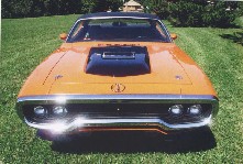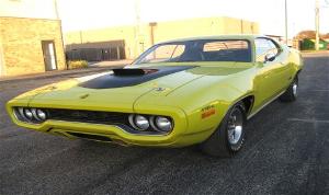 1971 Plymouth Road Runner. Recent restoration includes 472 ci/ 525 hp Hemi engine, 727 automatic transmission with slapstick shifter, power steering, air grabber hood, rear spoiler and painted in its factory color Hemi-orange.
